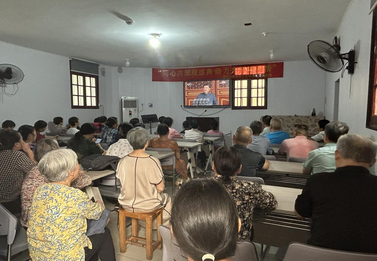 升旗仪式结束后,上午九点,会众一同观看天安门广场纪念大会实况直播。中共中央总书记、国家主席、中央军委主席习近平发表重要讲话并检阅部队。